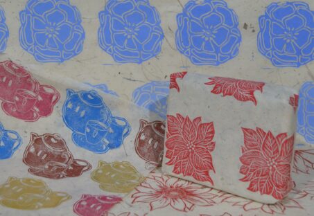 Make a set of personalised wrapping paper, a gift tag, and cards using a lino cutting technique